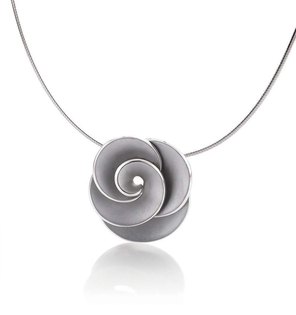 Satin-finish silver pendant with floral swirl motif with high polish edges, sold on signature double silver chain (not pictured).