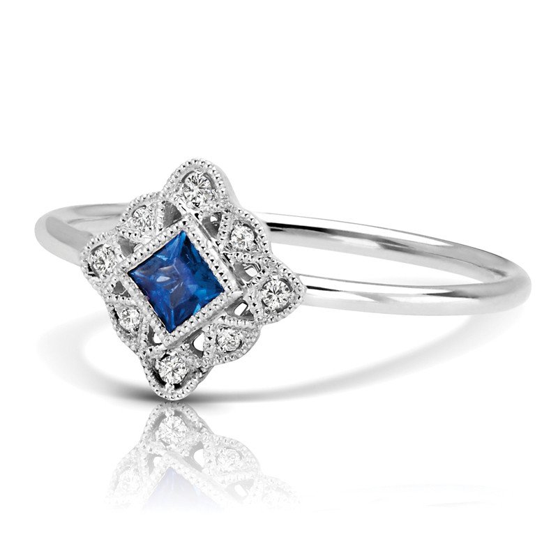 Delicate, vintage-inspired blue sapphire and diamond ring in white gold features a faceted square blue sapphire set in a beaded bezel surrounded by 8 round diamond accents.