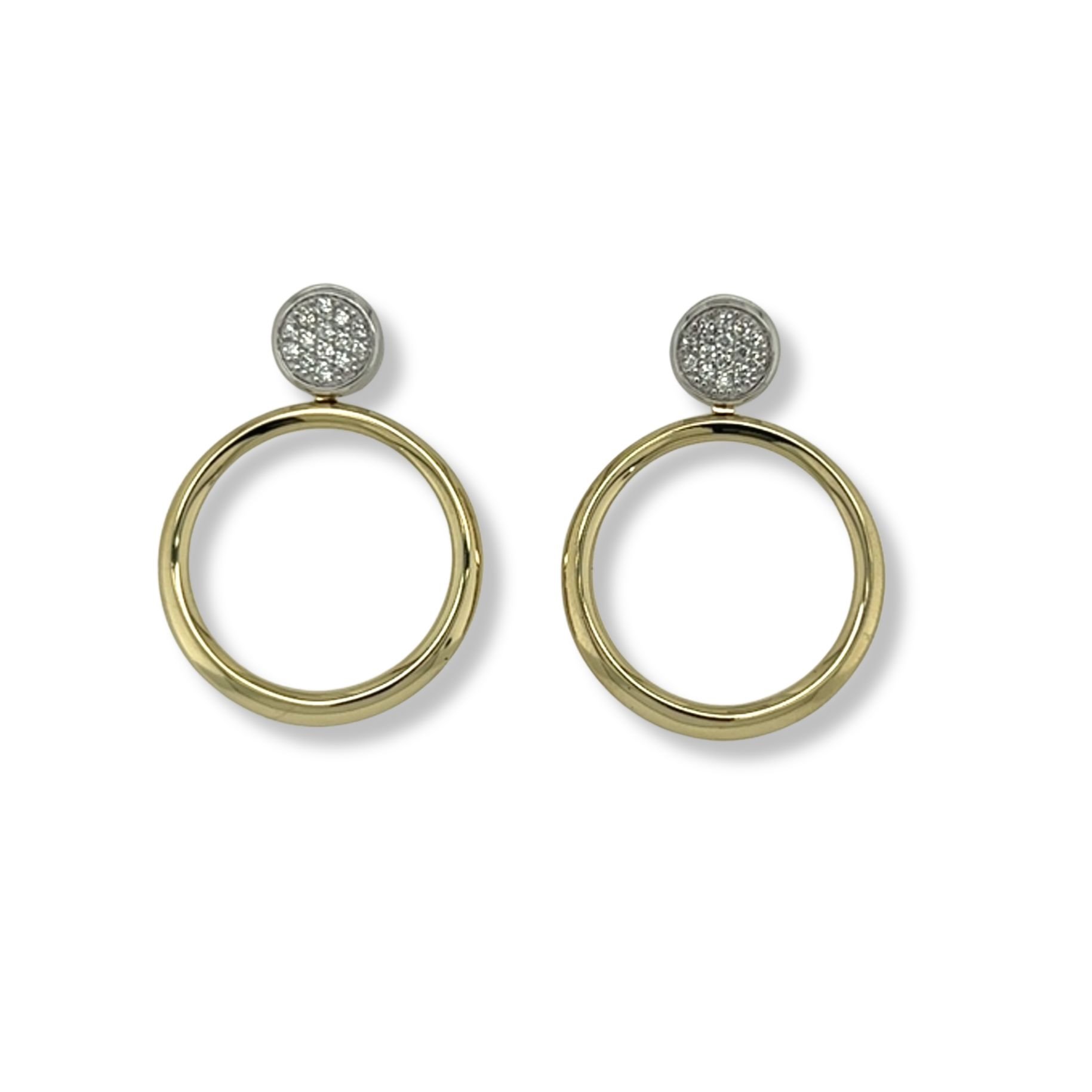 Two-tone post earrings feature a circle of pave-set diamonds set in white gold and a larger open circle in yellow gold and friction backs.