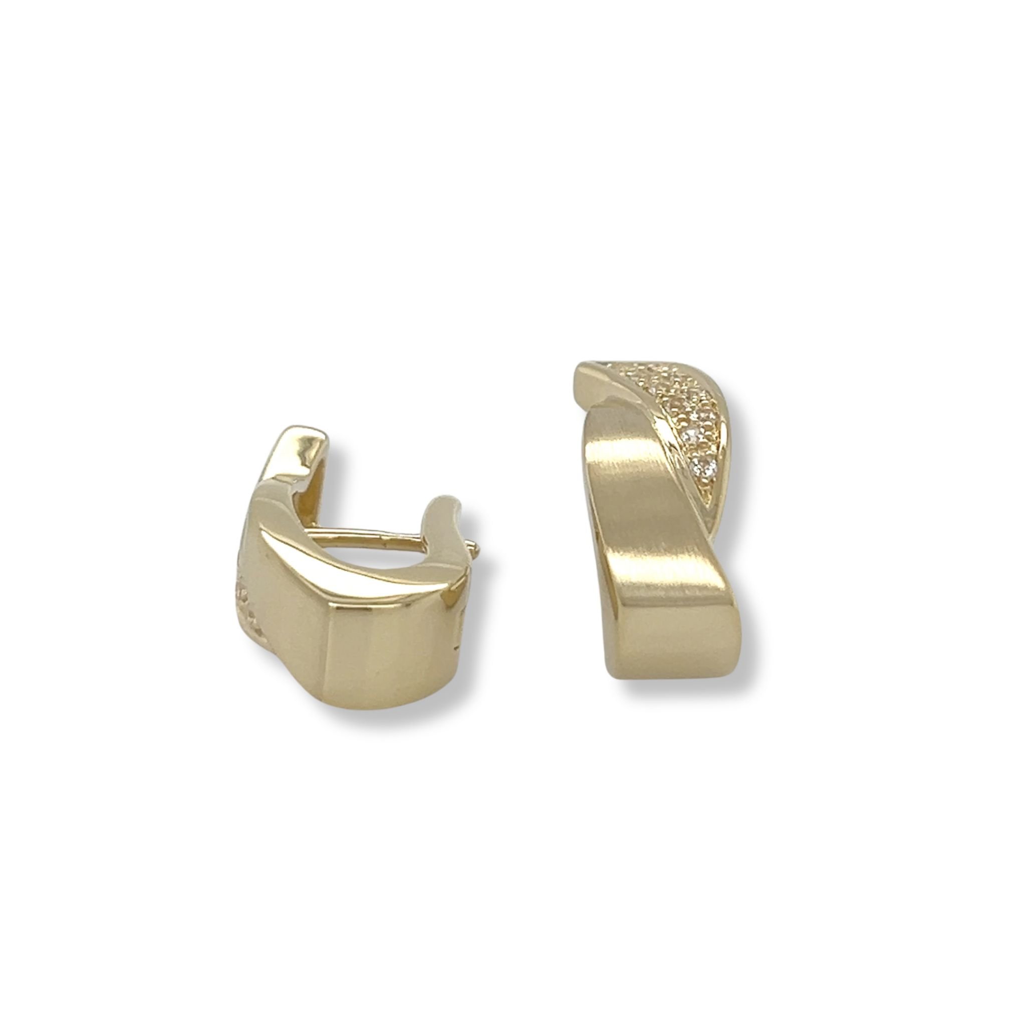 Elegant yellow gold-plated earrings in a satin finish with crossover design, featuring white sapphire accents and hinged post closure.