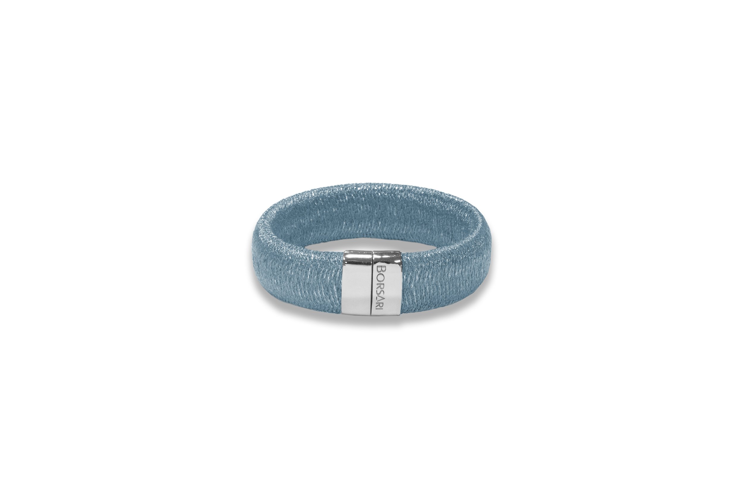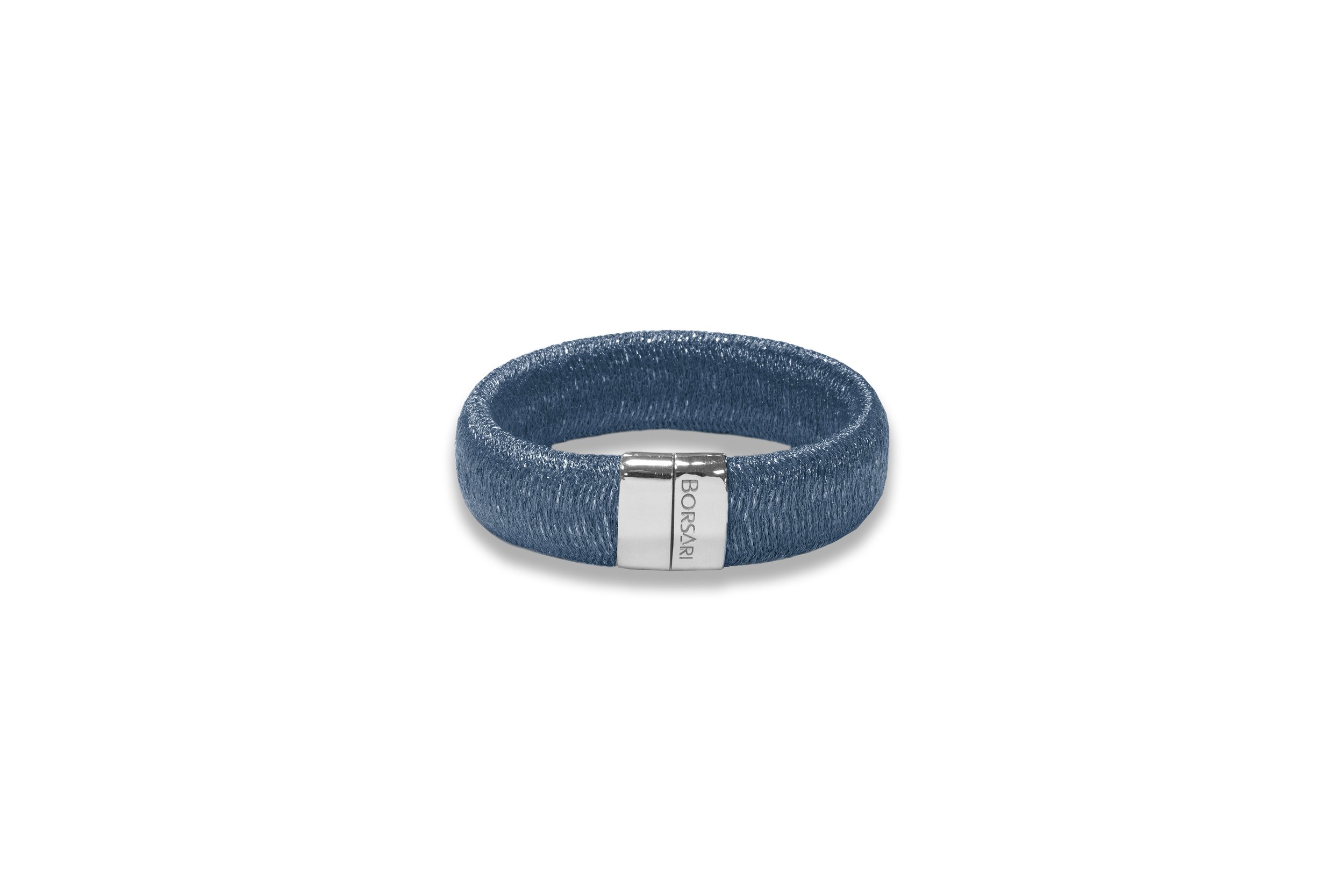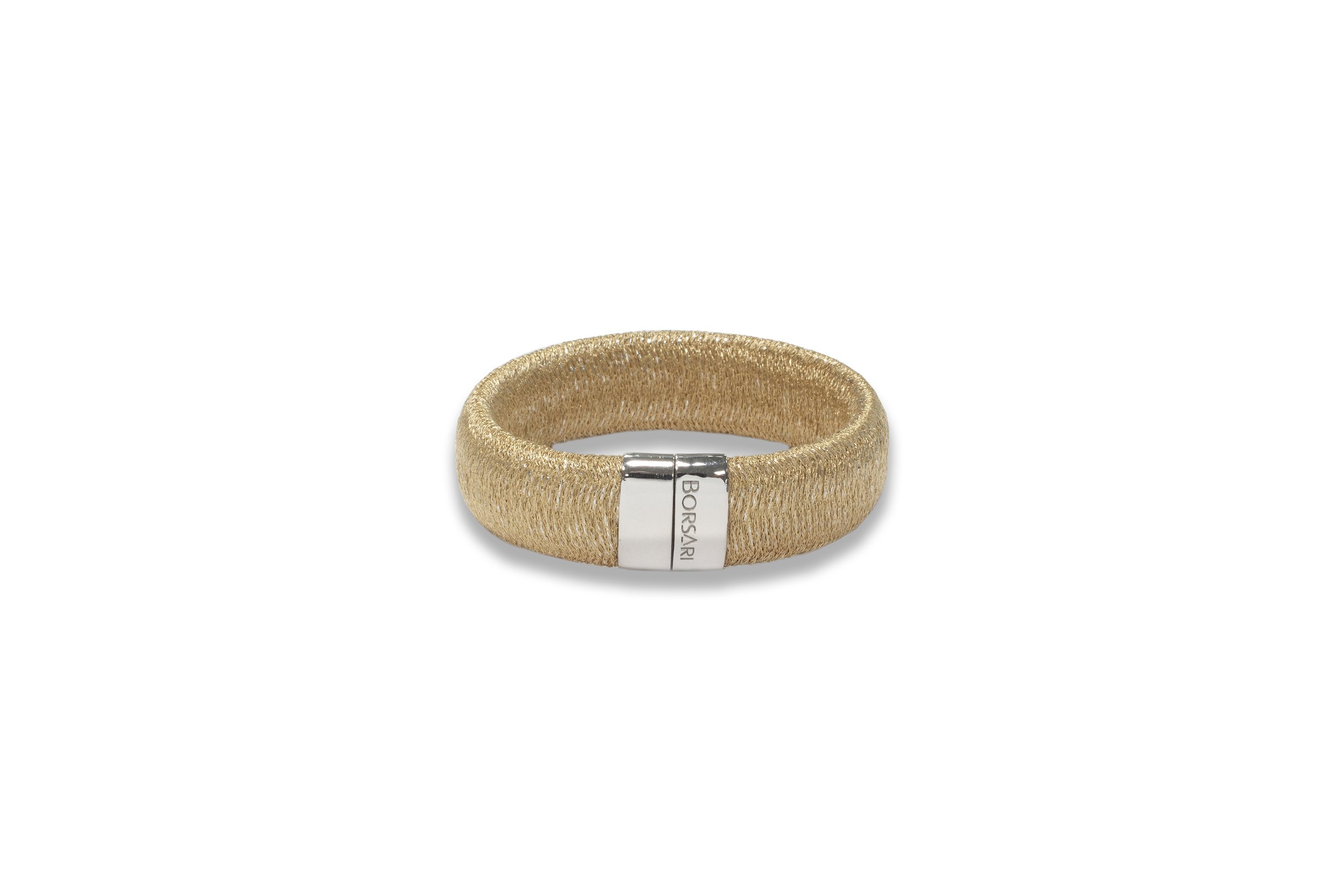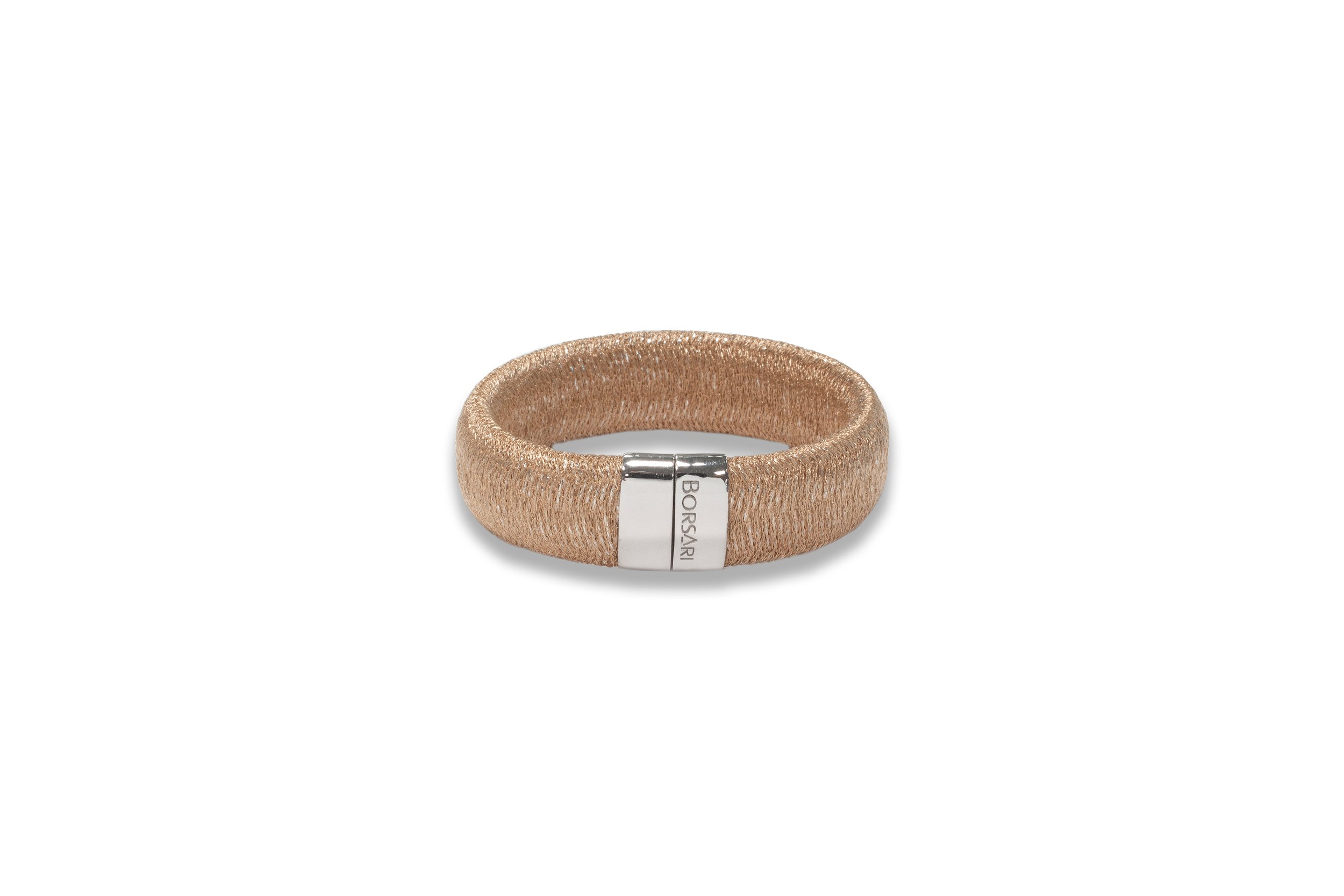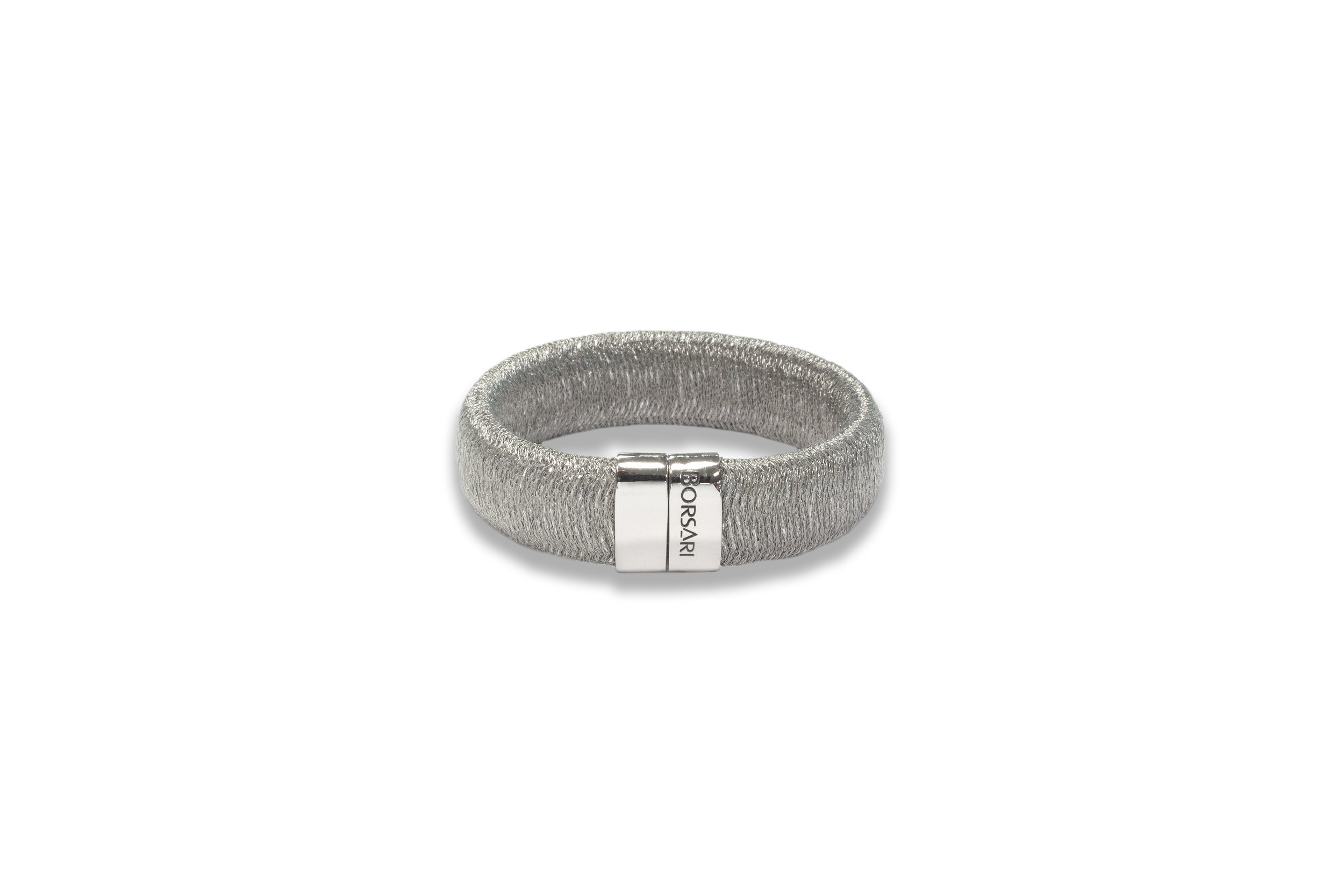 Classy flexible metallic mesh cuff bracelet with magnetic silver slide clasp.