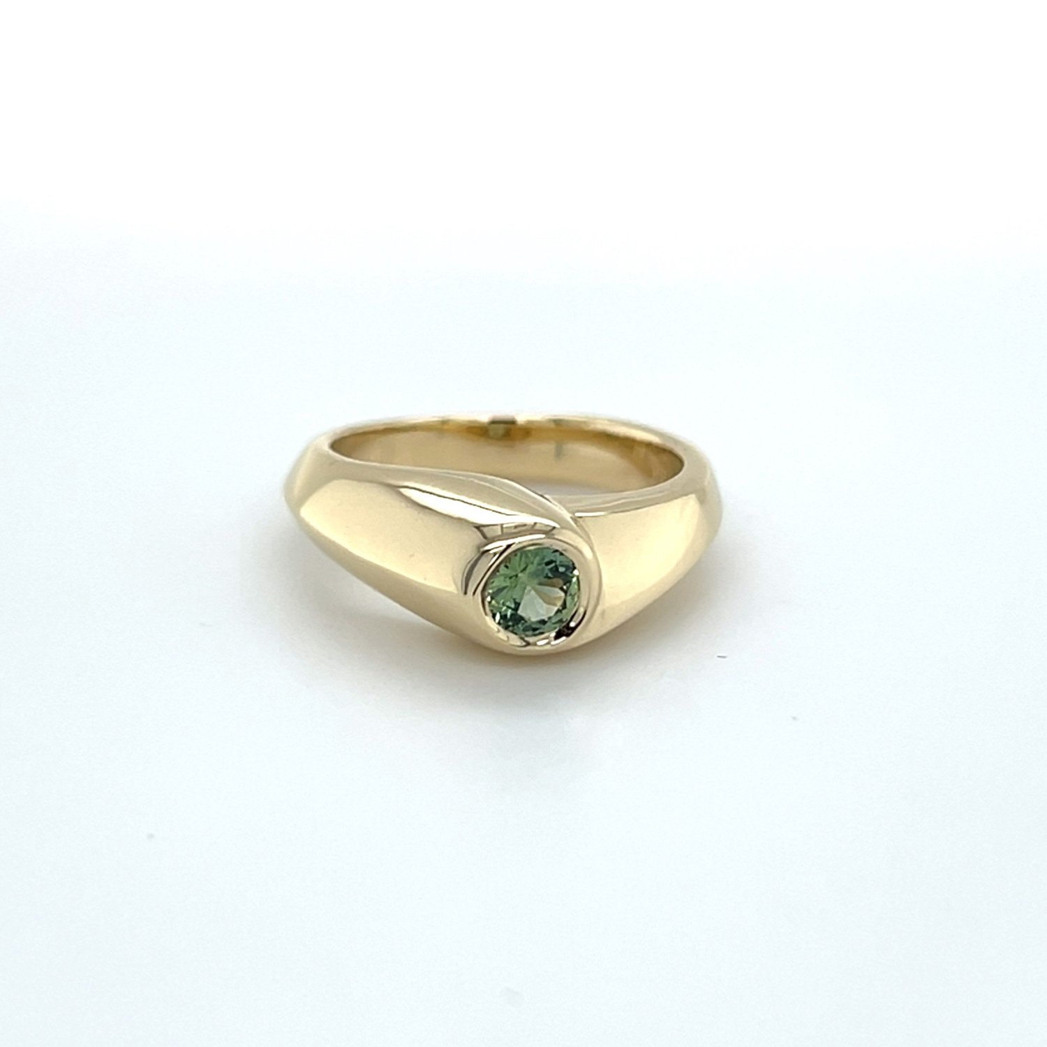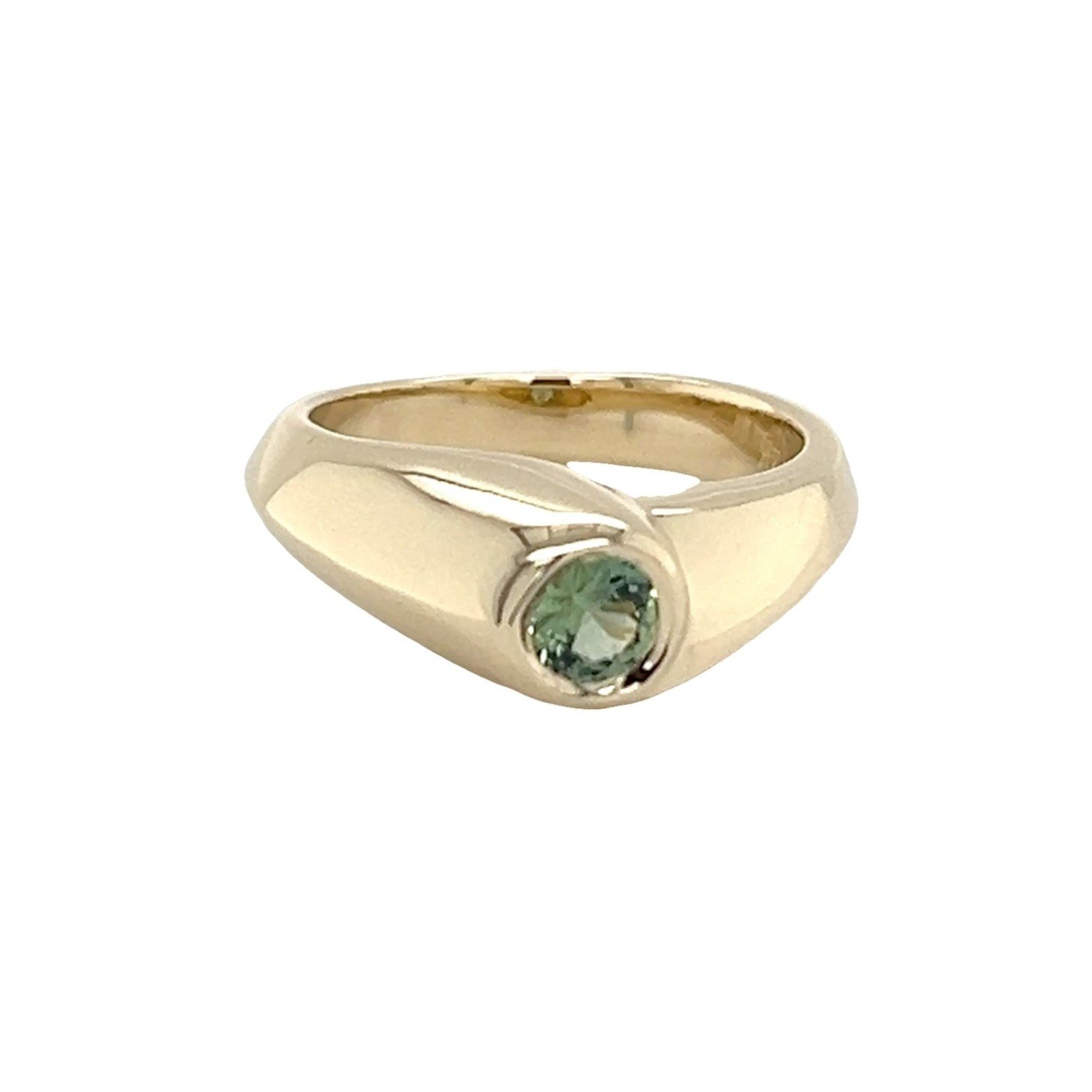 This simple but elegant ring boasts a light green Montana sapphire set in a modern bezel setting with a knife-edge shank.