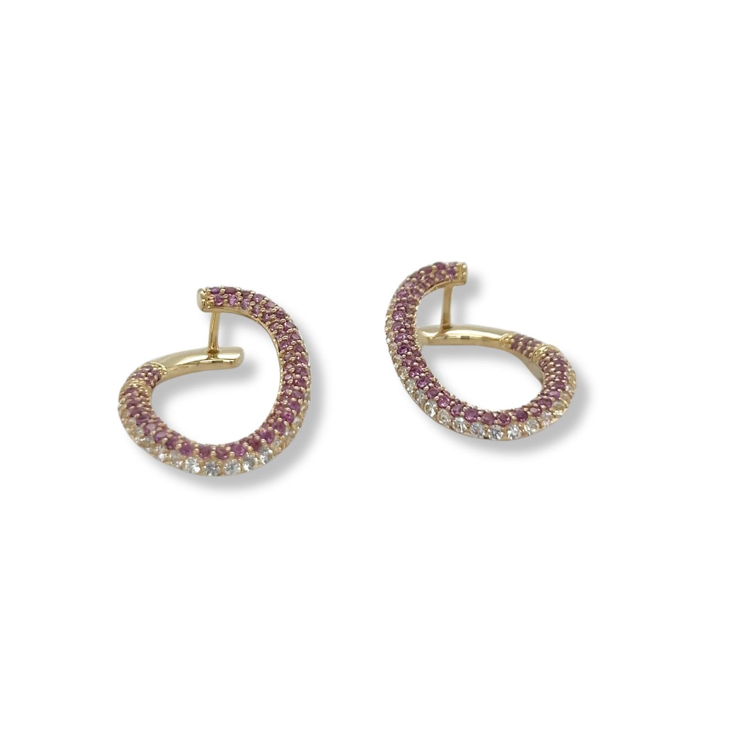 Offset front-facing oval hoops feature 2 rows of rhodolite garnets and 1 row of white sapphires and a hinged post closure.