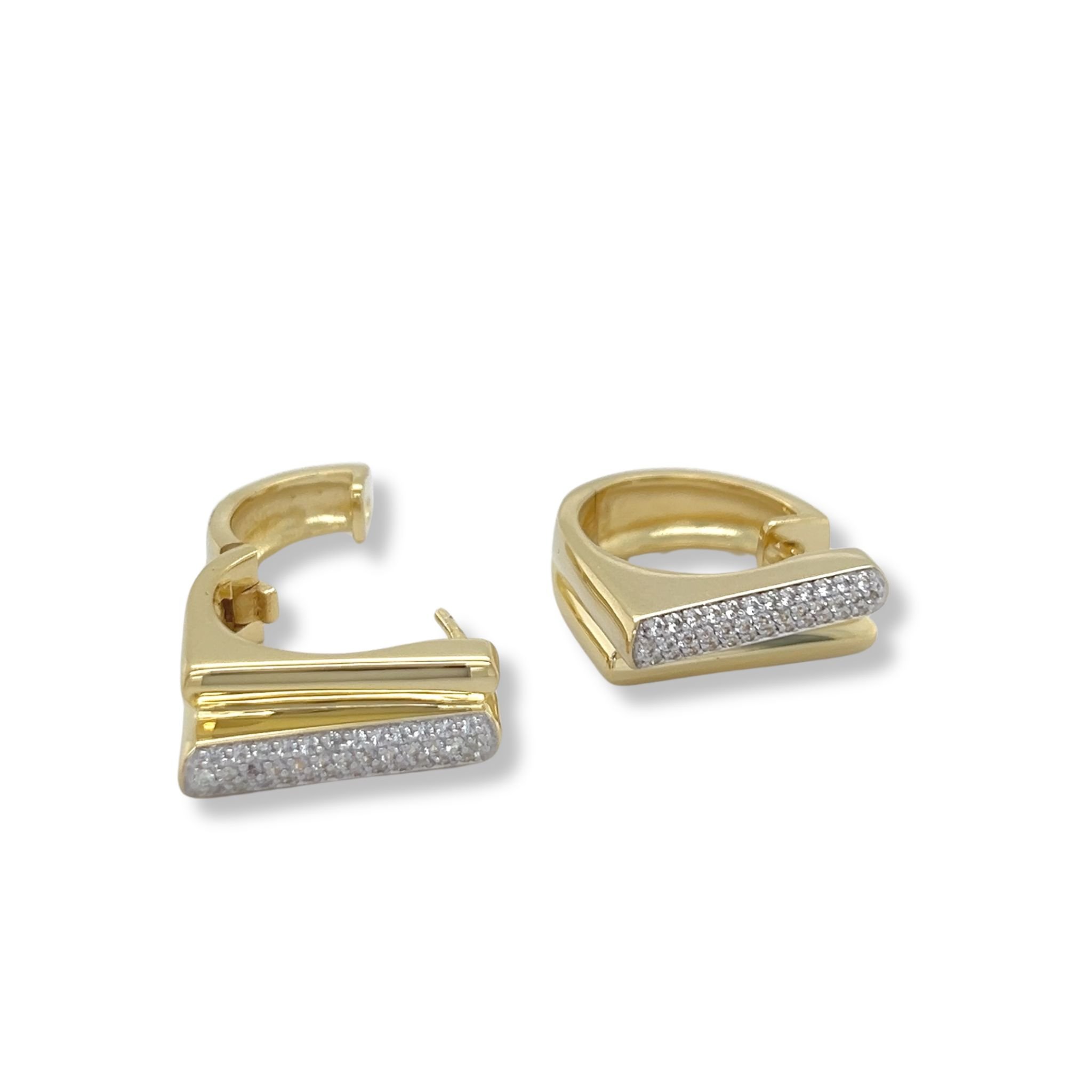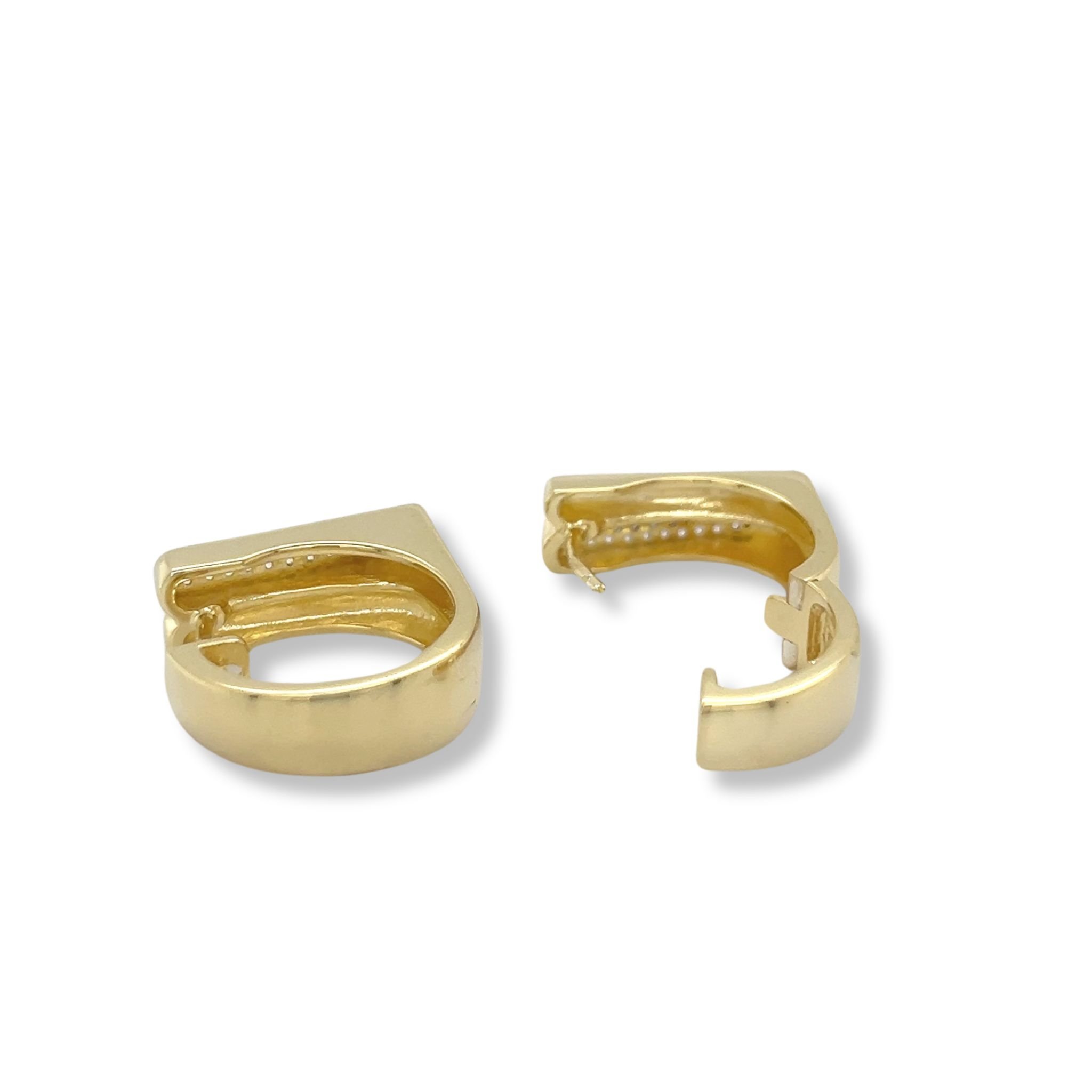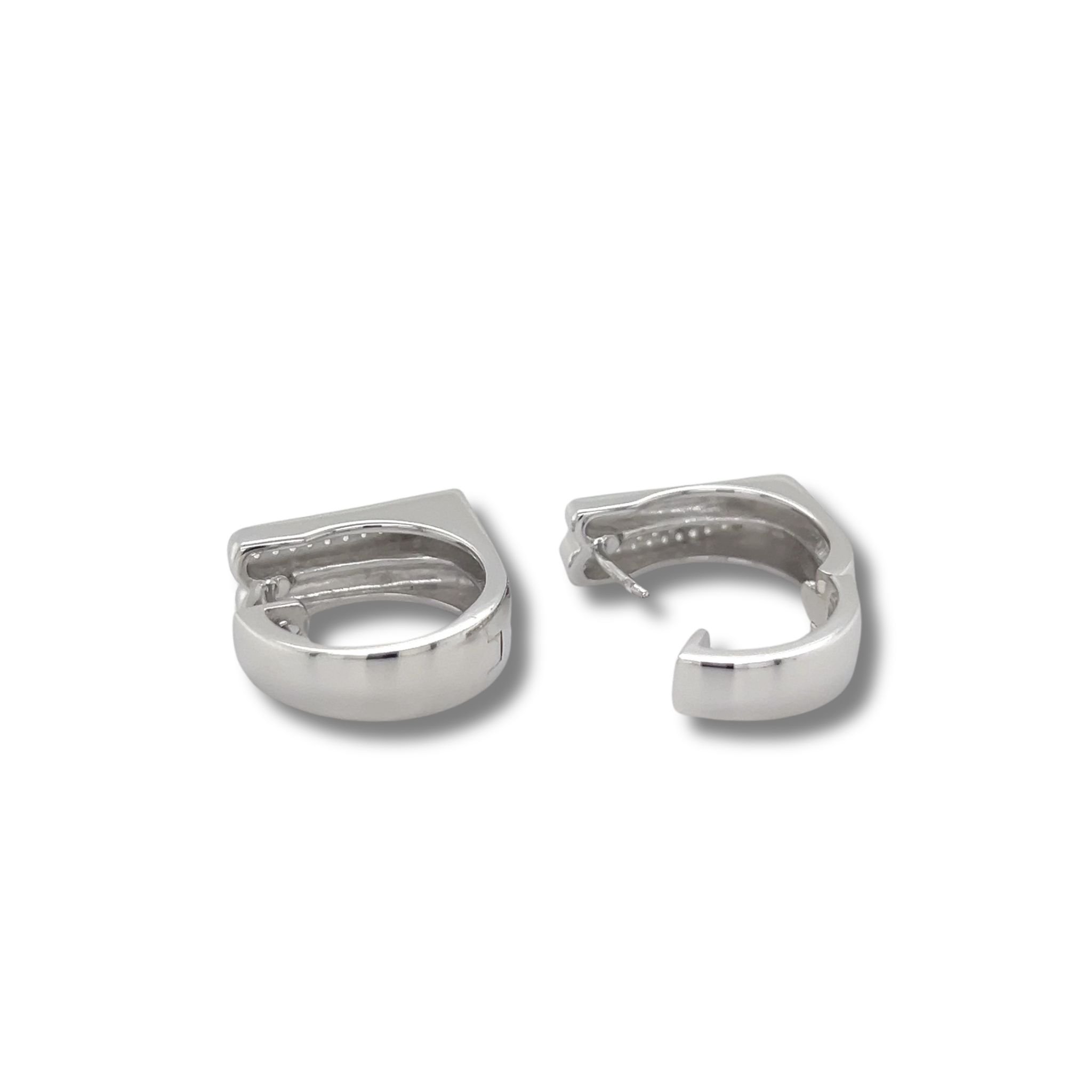 Round hoops with squared double bar front and white sapphire accents; hinged post closure.